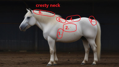 Hevosen lihavuuskuntoluokka tulee arvioida säännöllisesti ja pisteyttää eri alueet kropasta. Katso kuvasta pisteytettävät kohdat ja anna jokaiselle kohdalle erikseen arvosana välillä 1-9. Laske näiden keskiarvo -> hevosen tämänhetkinen lihavuuskuntoluokka. Eri lähteistä riippuen arviointikohtia voi olla vielä enemmän.