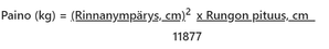 Kaavassa rinnanympärys tarkoittaa mahan ympärystä 2,5 cm sään korkeimman kohdan takaa mitattuna ja rungon pituus olkaluun pään ja istuinkyhmyn välistä matkaa. Täältä löytyy Hevoskoulutus.fi-sivuston laskuri . Laskuri käyttää yllä mainittua kaavaa. HUOM! Kaava ei toimi varsoilla ja aivan pienillä poneilla! - Toinen laskentakaava: Paino = (4,3 x rungonympärys) + (3,0 x säkäkorkeus) – 785.