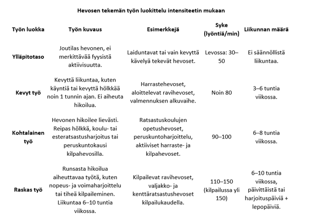 Alla olevassa taulukossa on esitetty työn intensiteetti luokittain esimerkkihevosineen.