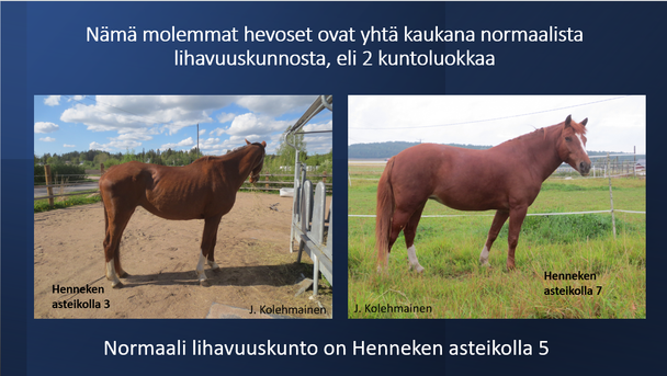 Hevosen normaali lihavuuskuntoluokka Henneken lihavuuskuntoluokitus 9-portaisella asteikolla on 5. Asteikolla 1 on erittäin laiha (eli aivan luurangonlaiha) ja 9 on sairaalloisen lihava (eli rasvaa on kaikkialla, koko hevosessa erittäin paljon). Nykyisin, kun ylipainoisten hevosten määrä lisääntyy, saattaa omistajan olla vaikeaa huomata oman hevosensa ylipainoa. Myös ammattilaisten arviot hevosen lihavuuskuntoluokasta vaihtelevat suuresti ja silmä tottuu turhan helposti lihavuuteen. Alla olevassa kuvaparissa on kaksi hevosta, joista molemmat ovat yhtä kaikana normaalista lihavuuskuntoluokasta. Kumpi sinun silmääsi on kauempana normaalipainosta?